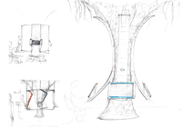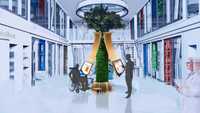 Un lieu centralisateur et accueillant dès l'entrée des patients au sein de DocCity avec une colonne végétale qui présente les bornes interactives via des structures en bois. Les bornes sont placées au centre en face des entrées, la signalétique verte autour de la borne indique aux patients que celle-ci est disponible, la couleur orange indique que que cette dernière est occupée. Le patient peut s’identifier sur la borne grâce à sa carte vitale soit manuellement en saisissant ses données personnelles. Le système préviendra automatiquement le médecin de son arrivée.